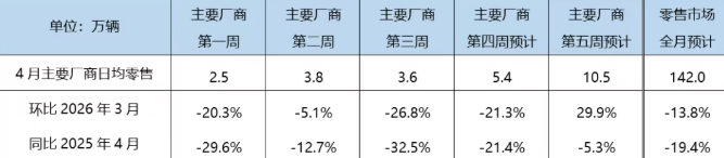 具体来看,4 月第一周恰逢清明假期,车市节奏受到一定影响,日均零售 2.5 万辆,终端环比出现较大回落。第二周日均零售 3.8 万辆,同环比降幅均有所收窄,终端热度稳步回升。第三周、第四周随着北京车展前新车密集发布亮相,终端客流及订单有所回升,但传导至终端交付仍需一定时间。月末随着车展预热效应进一步显现以及上市新车逐步开启交付,日均销量有望进一步走高,迎来阶段性小高峰。