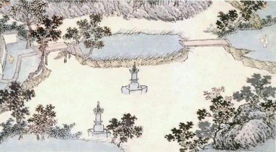 为表现悳茂的僧房,沈周特地在画中佛殿旁的院落里描绘了一个和尚的形象。另一个小僧正在院外的桥头迎接着即将过桥而来的“沈周”。就这样,悳茂与沈周“同框”了。